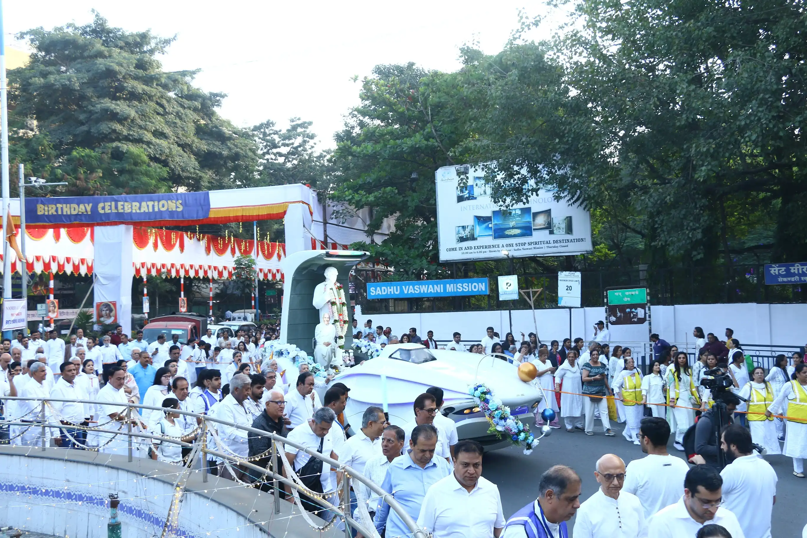 A major attraction was the Rath itself—an intricately designed, spaceship-like vehicle carrying a lifelike statue of Sadhu Vaswani and a standee of Dada JP Vaswani. As the Rath travelled the 5-kilometer route through Council Hall, Poona Club, Dorabjee, Babajan Chowk, Mahatma Gandhi Road, and other major landmarks, devotees gathered on both sides of the street to catch a glimpse and offer their homage. The atmosphere was filled with emotion as Didi Krishna Kumari, Head of the Sadhu Vaswani Mission, led the procession and distributed prasad to participants and passers-by.